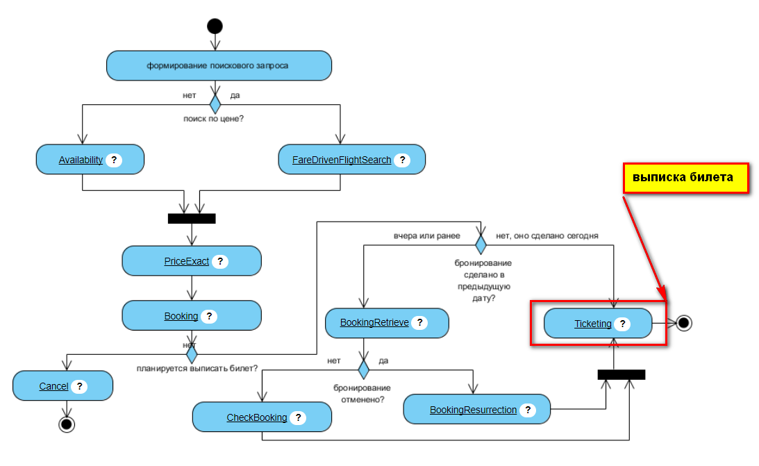 Выписка авиабилета (Ticket) — выписка бланка авиабилета. Актуально в том случае, если бронирование прошло проверку BookingRetrieve, маска актуализирована CheckBooking, или же бронирование было удачно восстановлено BookingResurrection.